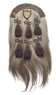 with cream fabric covered cantle above a gilt metal shield-shaped plaque inscribed 42 (42nd Highlanders), flanked by a thistle wreath, the grey horse hair body with six gold bullion work tassels suspended from single-knotted gold cords