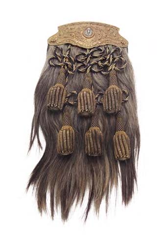 the gilt cantle cast with thistles and foliage, with central oval crest inscribed The Queen's Own Cameron Highlanders above a banner inscribed PENINSULA, EGYPT, WATERLOO, the grey horse hair body with six gold bullion wirework tassels suspended from double-knotted blue and gold cords, the purse inscribed to reverse R&HB Kirkwood, 66 & 68 Thistle Street, Edinburgh, suspended from a silver fetter link chain