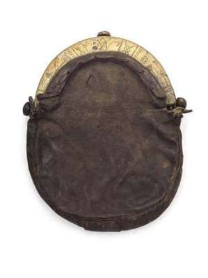 the plain worn leather purse surmounted by a brass cantle, crudely engraved with stylised thistles, St Andrew's cross, and monogrammed, with push-button opening mechanism