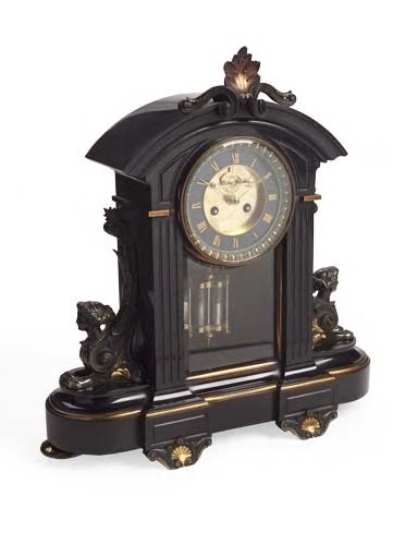the movement with anchor escapement striking on a bell, the domed case with shell and scroll cast pediment above glazed brass dial with black Roman chapter ring, above glazed panel enclosing mercury filled pendulum, flanked by scrolled sphinxes, on breakfront plinth base with scroll and shell cast feet