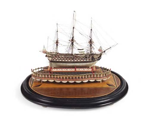 modern, the finely detailed 86 Gun Man-of War on two-tier galleried painted and inlaid plinth, resting on an oval marquetry base and ebonised plinth with bun feet, under glass dome