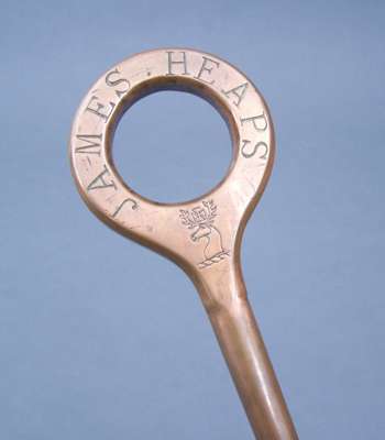 with pierced and flatted circular handle, inscribed, 'James Heaps', with stamped crown and stags head motifs and with a tapering shaft