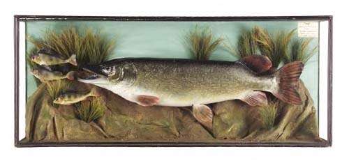 in a naturalistic river setting with three stuffed and mounted perch, within a rectangular glazed & ebonised case, with label inscribed 'Pike, taken on a Perch dead bait, Loch Lomond, January 16th 1976, 18lbs 1oz'