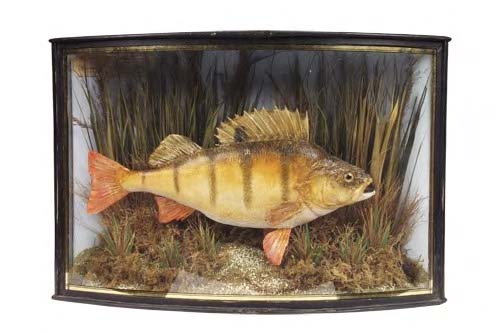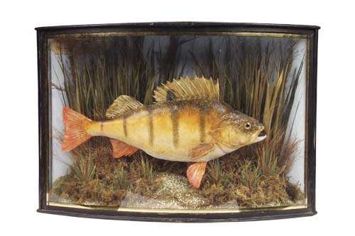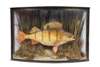 in a in a naturalistic river setting, within a rectangular case with bowed glazed front, with label inscribed 'Caught at 'Chertsey' by D.B. Heather, January 27th 1911 Weight 1lb 15ozs'
