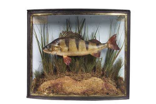 in a naturalistic river setting, within a rectangular case with bowed glazed front, with label inscribed 'Perch, caught by J.T.R. Cary, Chipping Norton, September 1st 1914, weight 14ozs, 2 dams'