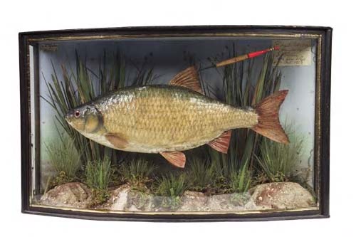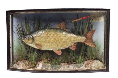 in a naturalistic river setting, within a rectangular case with bowed glazed front, with label inscribed 'Roach caught by S. Martin on the Wye, 4th October 1923', and with preservers label, 'Preserved by W.F. Homer, 105 Woodgrange Road, Forest Gate, London E.'