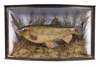 in a naturalistic river setting, within a rectangular case with bowed glazed front
