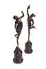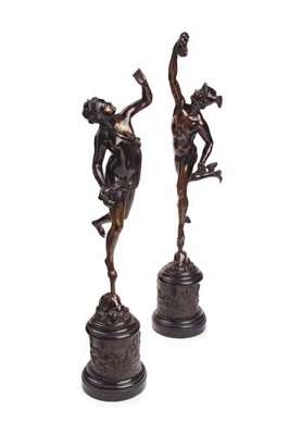 a pair of French bronze figures, late 19th/early 20th century, Mercury with winged helmet and ankles supported on a head emblematic of wind, Fortuna balancing on a wheel with left arm upheld, each raised on a circular marble base decorated with a bronze relief of putti (2)