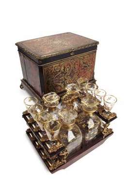 the rectangular case with tortoiseshell veneer, elaborately inlaid with engraved brass, the hinged lid and front opening to reveal an interior fitted with a lift out tray holding sixteen stemmed glassed and four decanters and stoppers, each with allover gilded decoration