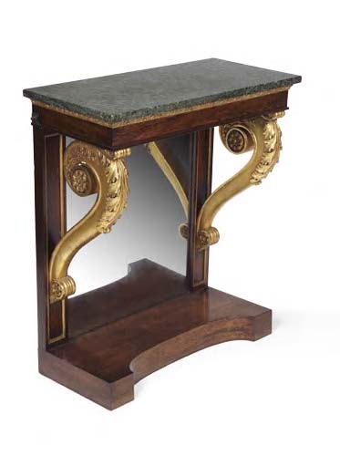 the rectangular Verde Antico marble top above a plain frieze with leaf mouldings, the mirrored back supported by scrolling consoles raised on a concave plinth base