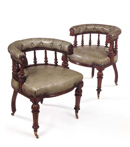 A pair of early Victorian mahogany and leather upholstered library armchairs,