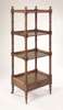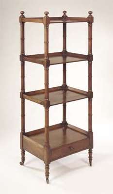 the four rectangular galleried tiers supported by ring turned and block uprights, surmounted by turned finials, above a single drawer, on turned legs with brass caps and castors