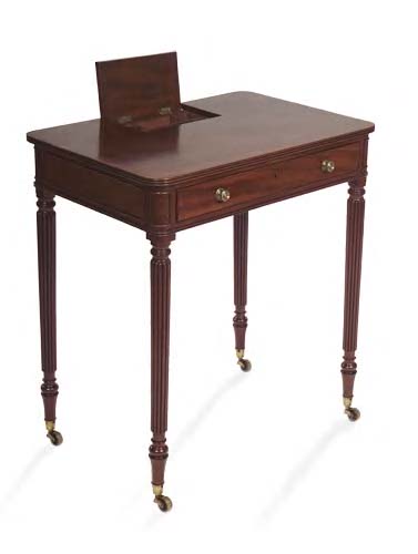 attributed to Gillows, the rounded rectangular reeded top, with hinged rectangular compartment opening to reveal an interior fitted for pens and inkwells, above a frieze drawer, on turned, reeded and tapering legs, terminating in brass caps and castors