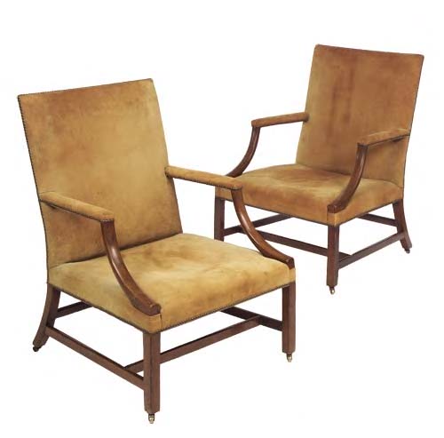 A pair of George III mahogany and hide upholstered Gainsborough armchairs,