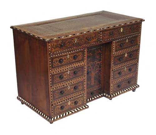 An early 18th century Continental walnut and marquetry kneehole desk,