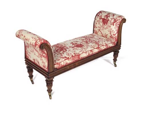 the rectangular seat with moulded rail and squab, outscrolled raised ends, turned and reeded lobed feet with brass caps and castors
