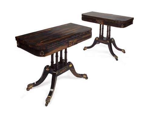 A pair of Regency calamander-veneered turnover card tables,