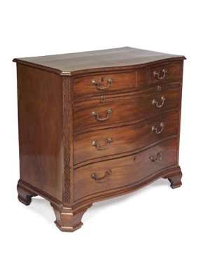 the shaped top with moulded edge, above a single long drawer and brushing slide, over three further long graduated drawers flanked by canted angles with blind fretwork panels, the whole raised on ogee bracket feet