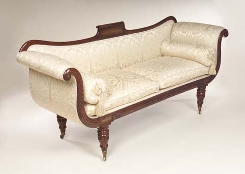 the scrolling back centred by a brass inset tablet surmounted by gadrooned scroll, the back, outscrolled arms, seat and cushions upholstered in cream damask fabric, the seat rail with acanthus carved tablet flanked by brass inset tablets, on ring turned tapering legs terminating in brass caps and castors