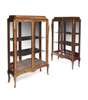 early 20th century, each with crossbanded cavetto frieze set with applied foliate cartouche, above twin glazed doors enclosing a mirrored back with adjustable shelves, flanked by tapering angles with applied foliate mounts and glazed side panels, the whole raised on square cabriole legs with applied cast sabots (2)