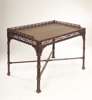 of Chinese Chippendale style, the moulded rectangular top with three-quarter pierced fretwork gallery, above similar pierced fretwork frieze and spandrels, on triple column and chamfered block legs joined by double column X stretcher, on moulded chamfered block feet