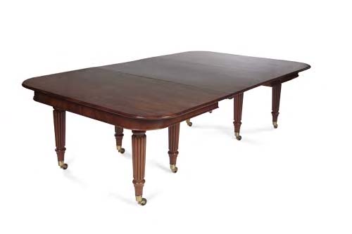 the rectangular top with rounded angles, above a plain frieze on turned and reeded tapering legs terminating in brass caps and castors, includes three additional leaves
