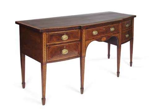 of semi-bowed form, the shaped top with boxwood and ebony stringing above a central drawer above an apron with inlaid patera, flanked to one side by a deep drawer with twin false drawer front and with fitted cellar interior, and to the other with two corresponding short drawers, the whole raised on square tapering uprights inlaid with husk pendants and terminating in spade feet