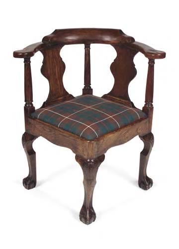 the curved back with shaped yoke raised on three turned columns and pair of vase splats, drop-in seat and shaped cabriole legs with shells and ball and claw feet