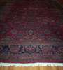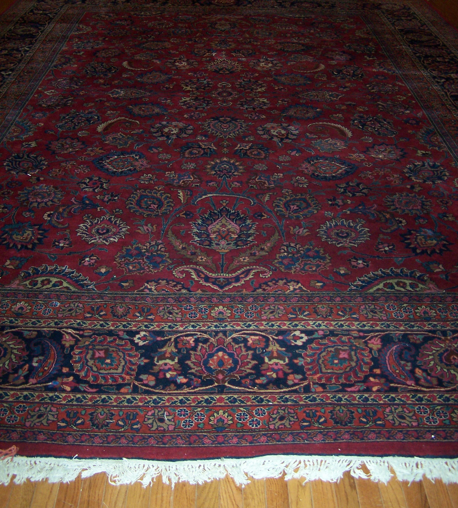 the crimson field with allover pattern of palmettes and scrolling vine, within indigo palmette and scrolling vine border, between similar rust red and other guard bands, signature cartouche to one end