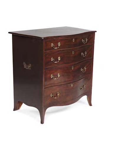 the shaped top with moulded edge above four long graduated drawers on splayed bracket feet, carry handles to sides