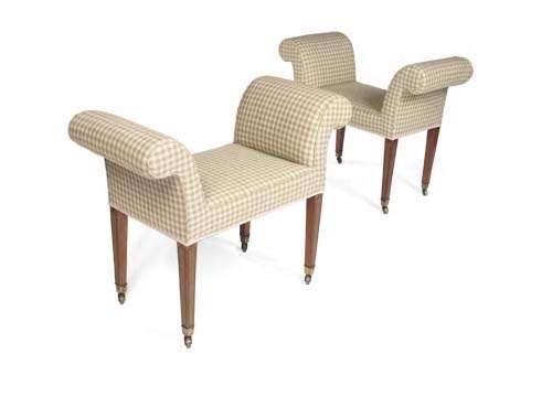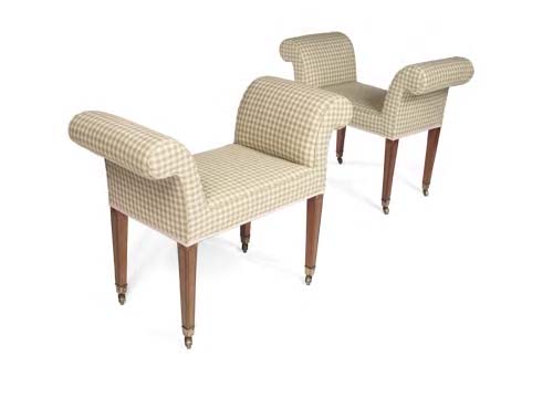 with outscrolled upholstered sides and seat raised on square section tapered legs with inlaid panels, brass caps and castors (2)
