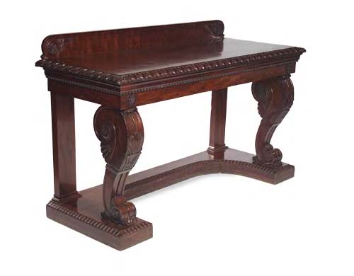 the ledge back with rosette and leaf scroll terminals, the rectangular top with stylised and boldly carved egg and dart mouldings above two massive scrolled consoles with anthemion carvings, raised on a shaped plinth base with moulded edge