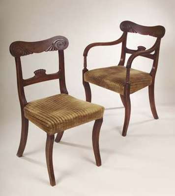 the scrolled tablet toprail above gadrooned horizontal splat, the downswept channelled arms on ring turned supports, the upholstered seat on channelled sabre legs, 57cm wide; and a side chair en suite, 57cm wide (2)