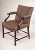 part 18th century, the close nailed back seat and arms covered in striped brown fabric, acanthus carved scroll arm terminals and downswept supports, on imitation bamboo splayed legs joined by stretchers