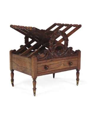 the three open X-framed compartments with laurel wreath facings, raised on rectangular base with drawer, turned feet with brass caps and castors