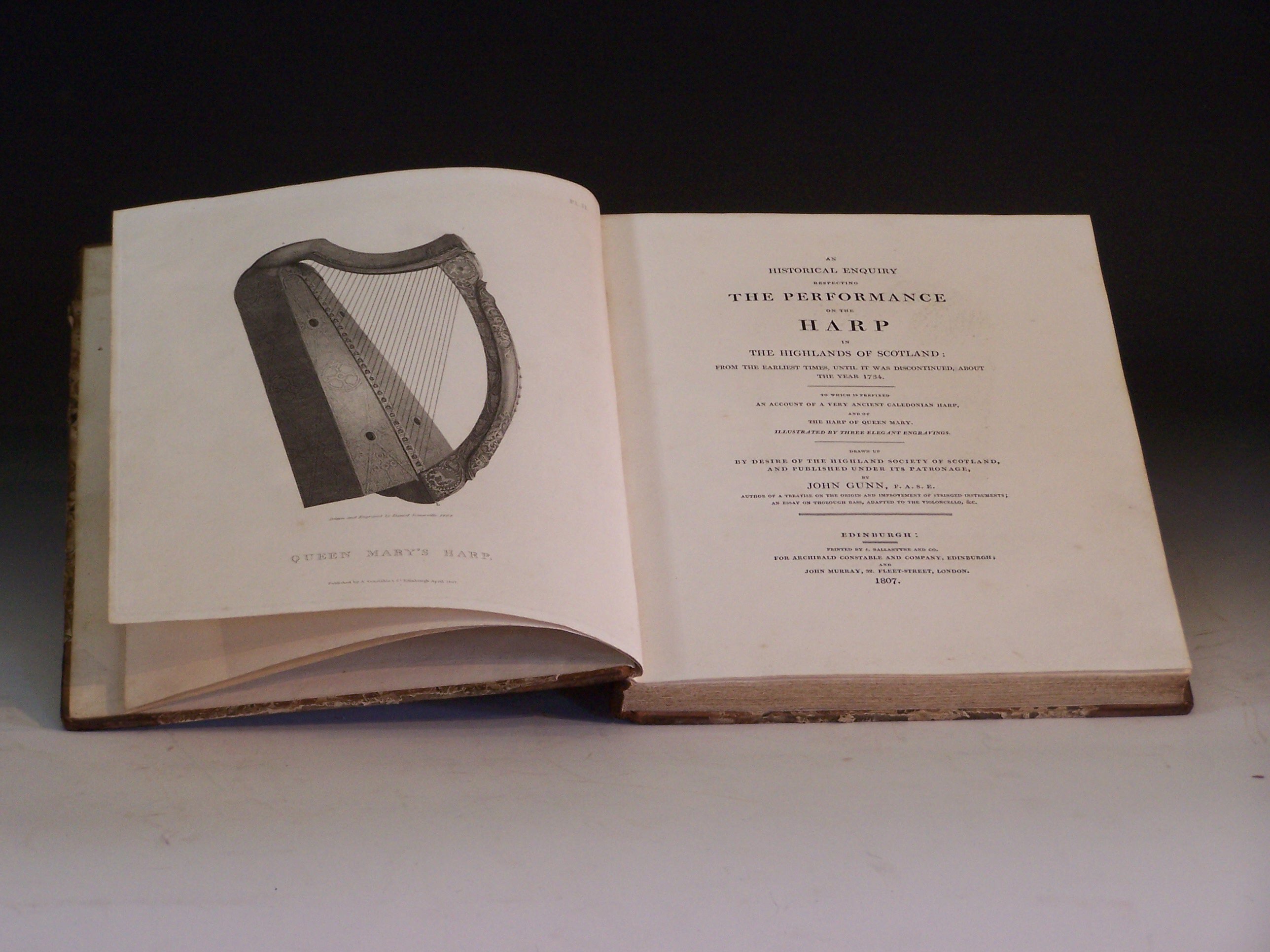 An Historical Enquiry respecting the Performance on the Harp in the Highlands of Scotland. Edinburgh: A. Constable, 1807, first edition, 4to, 3 engraved plates, half-title, contemporary half calf, small wormhole to upper joint