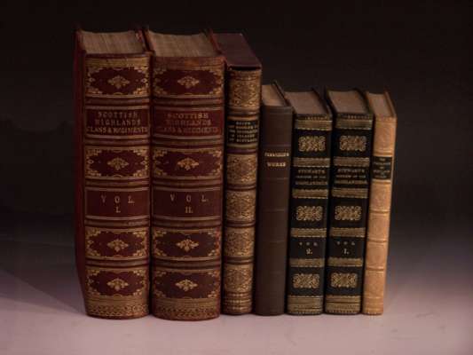 History of the Scottish Highlands, Highland Clans and Highland Regiments. Edinburgh: T.C. Jack, 1887, 2 volumes, 8vo, 71 plates (42 coloured plates of tartans), and 1 map, contemporary red half morocco, slightly rubbed; Stewart, David. Sketches of the Character, Manners, and Present State of the Highlanders of Scotland. Edinburgh: A. Constable, 1822, second edition, 2 volumes, 8vo, 1 folding printed table, contemporary blue calf, sides tooled in blind and gilt, spines gilt, bookplates of Sir Alfred Sherlock Gooch, somewhat spotted; Reid, John T. Art Rambles in the Highlands and Islands of Scotland. London: G. Routledge, 1878, 8vo, illustrations by Dalziel Brothers, brown morocco gilt by Bickers and Sons, gilt stamp of The College of Preceptors on sides, spine gilt, g.e., slipcase; Quigley, Hugh The Highlands of Scotland. London, 1949, 8vo, tree calf gilt, spine gilt; Pennecuik, Alexander. The Works of Alexander Pennecuik of New-Hall, containing the Description of Tweeddale. Leith, 1815, 8vo, folding map, modern calf-backed boards, slightly spotted, map split at one fold (7)