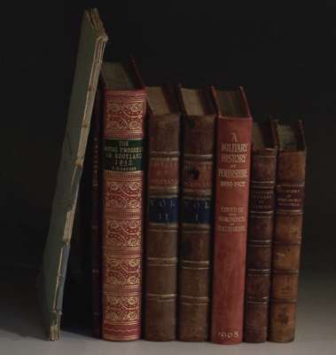 Memorial of the Royal Progress in Scotland. Edinburgh, 1843, first edition, 4to, list of subscribers, 13 engraved plates, wood-engravings in the text, bookplate of Peter Carmichael, contemporary red half morocco gilt; Robertson, William. The History of Scotland. London, 1759, second edition, 2 volumes, 4to, contemporary calf, spines gilt; Crawfurd, George and William Semple. The History of the Shire of Renfrew. Paisley, 1782, 4to, bookplate of Frances Mary Richardson Currer, contemporary calf, some spotting, head of spine slightly rubbed; Sconiana. Memoranda of the Antiquities, Curiosities, History and Present State of Scone. Edinburgh, 1807, first edition, 4to, 5 engraved plates, contemporary quarter roan, some spotting, boards somewhat soiled; [Bridge Construction] Report of the Commissioners for making Roads and building Bridges in the Highlands of Scotland. London, 1804, 4to, folding engraved map, partly hand-coloured, original wrappers, map torn without loss, spine worn; Bruce, John. History of the Parish of West or Old Kilpatrick. Glasgow, 1893, first edition, 8vo, plates, contemporary half calf, upper joint splitting; Tullibardine, Marchioness of. A Military History of Perthshire 1899-1902. Perth, 1908, first edition, 8vo, plates, original red calf gilt, gilt arms on upper cover (8)