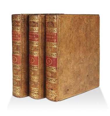 A Tour in Scotland, MDCCLXIX. London: B. White, 1790, fifth edition; A Tour in Scotland and a Voyage to the Western Hebrides, MDCCLXXII. London: B. White, 1790, together 3 volumes, 4to, engraved titles, folding map and 131 (of 132) engraved plates, uniform contemporary tree calf, spines gilt, red morocco lettering pieces, lacking plate 13 in volume 2