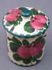 of cylindrical form, painted with red plums, impressed and painted marks 'Wemyss', and black printed retailers mark (2)