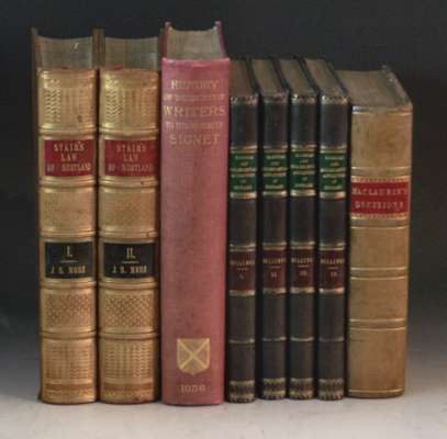 The Institutions of the Law of Scotland. Edinburgh: Bell & Bradfute, 2 volumes, 4to, contemporary calf gilt, g.e.; Billings, R.W. The Baronial and Ecclesiastical Antiquities of Scotland. Edinburgh: E. Saunders, 1908, 4 volumes, 4to, plates, contemporary half calf, spines gilt, slightly spotted; Hannay, R.K. & others. The Society of Writers to His Majesty's Signet. Edinburgh, 1936, 4to, plates, original buckram; Maclaurin, John Arguments and Decisions in Remarkable Cases before the High Court of Justiciary. Edinburgh: J. Bell, 1774, 4to, modern half calf (8)