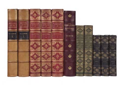 Sketches of the Character, Manners and Present State of the Highlanders of Scotland, 1822, first edition, 3 volumes, 8vo, folding hand-coloured map, half-titles, modern half calf, t.e.g., others uncut; Skene, William F. The Highlanders of Scotland, 1902, 8vo, edited by A. MacBain, 2 plates, map, maroon half morocco gilt, t.e.g., uncut; Chambers, Robert. Domestic Annals of Scotland, 1874, 3 volumes, 8vo, illustrations, contemporary red half morocco, spines gilt, t.e.g.; Aytoun, William E. The Ballads of Scotland, 1859, second edition, 2 volumes, 12mo, bookplate of George H. Cox, green morocco gilt, g.e.; The Society of Ancient Scots. Lives of Scottish Poets, 1821-22, 6 parts in 3 volumes, 12mo, engraved titles and frontispieces, contemporary black morocco gilt, g.e. (11)