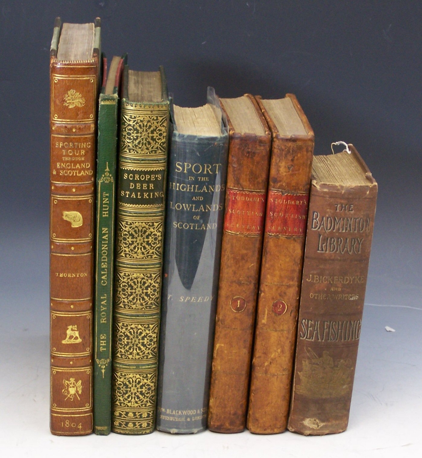 A Sporting Tour through the Northern Parts of England and great part of the Highlands of Scotland. London, 1804, first edition, 4to, 16 engraved plates, green half morocco by Bayntun, emblematically tooled on spine, some light spotting, spine faded; Clark, R., printer. The Royal Caledonian Hunt, instituted 1777, 1871, 4to, green half morocco gilt; Scrope, William. The Art of Deer Stalking, 1838, first edition, 8vo, additional engraved title and 11 lithographed or engraved plates, contemporary green morocco gilt by W. Nutt, g.e.; Stoddart, John. Remarks on Local Scenery & Manners in Scotland during the years 1799 and 1800, 1801, first edition, 2 volumes, 8vo, engraved titles, double-page map and 32 sepia aquatint plates, contemporary tree calf; [Abbey, Scenery 483] and 2 others by Speedy and Bickerdyke (7)