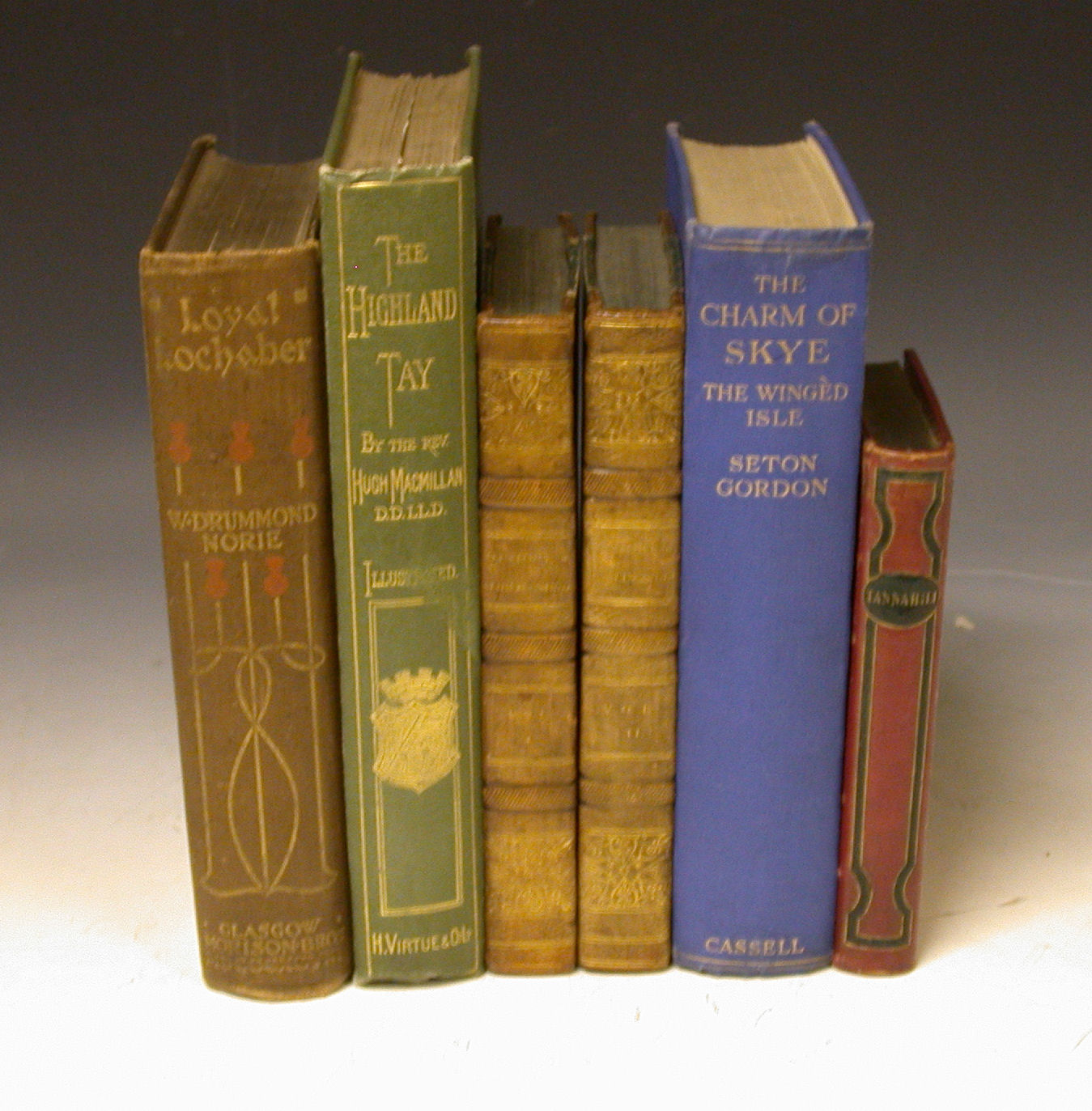 A Voyage round the Coasts of Scotland and the Isles, 1842, first edition, 2 volumes, 8vo, folding map and 19 (of 20) engraved plates, half calf, spines gilt, final leaf in volume 1 repaired; Grampian Club. Registrum Monasterii S. Marie de Cambuskenneth A.D. 1147-1535, 1872, 4to, lithographed title and plates, original red cloth gilt; Macmillan, Hugh. The Highland Tay, 1901, first edition, 4to, plates by A. Scott Rankin, original pictorial cloth gilt, t.e.g.; Maxwell, Alexander. The History of Old Dundee, 1885, 2 volumes, 4to, folding map, plates, contemporary half calf; Nimmo, William and William MacGregor Stirling. History of Stirlingshire, 1817, second edition, 2 volumes, 8vo, 2 maps (1 hand-coloured and folding), 2 engraved plates, 2 folding printed tables, contemporary half calf, spines gilt; Chambers, William. The Book of Scotland, 1830, first edition, 8vo, half-title, later green half morocco, t.e.g., others uncut; Wade, W.M. A Tour of Modern, and Peep into Ancient, Glasgow, 1822, first edition, 12mo, folding plan, contemporary half calf; Tannahill, Robert. The Works, 1875, 12mo, engraved frontispiece and title, red morocco, covers and spine with geometric black morocco onlays, g.e.; Green, Samuel G. Scottish Pictures drawn with Pen and Pencil, 1866, 4to, illustrations, original pictorial cloth gilt; Eyre-Todd, George. The Visit of His Majesty King George V to the Glasgow and the Clyde Area, 17th to 21st September 1917, 1918, folio, 37 plates, original cloth, some spotting, binding slightly marked; Gordon, Seton. The Charm of Skye, 1929, first edition, 8vo, plates, original cloth; Drummond-Norie, W. Loyal Lochaber and its Associations, 1888, first edition, one of 500 copies, 8vo, plates, original cloth, t.e.g.; Sharp, J.F.M. The Thoroughbred Mares Record, 1929, 4to, plates, black morocco; and 9 others including 2 issues of The Scots Angler in wrappers (25)