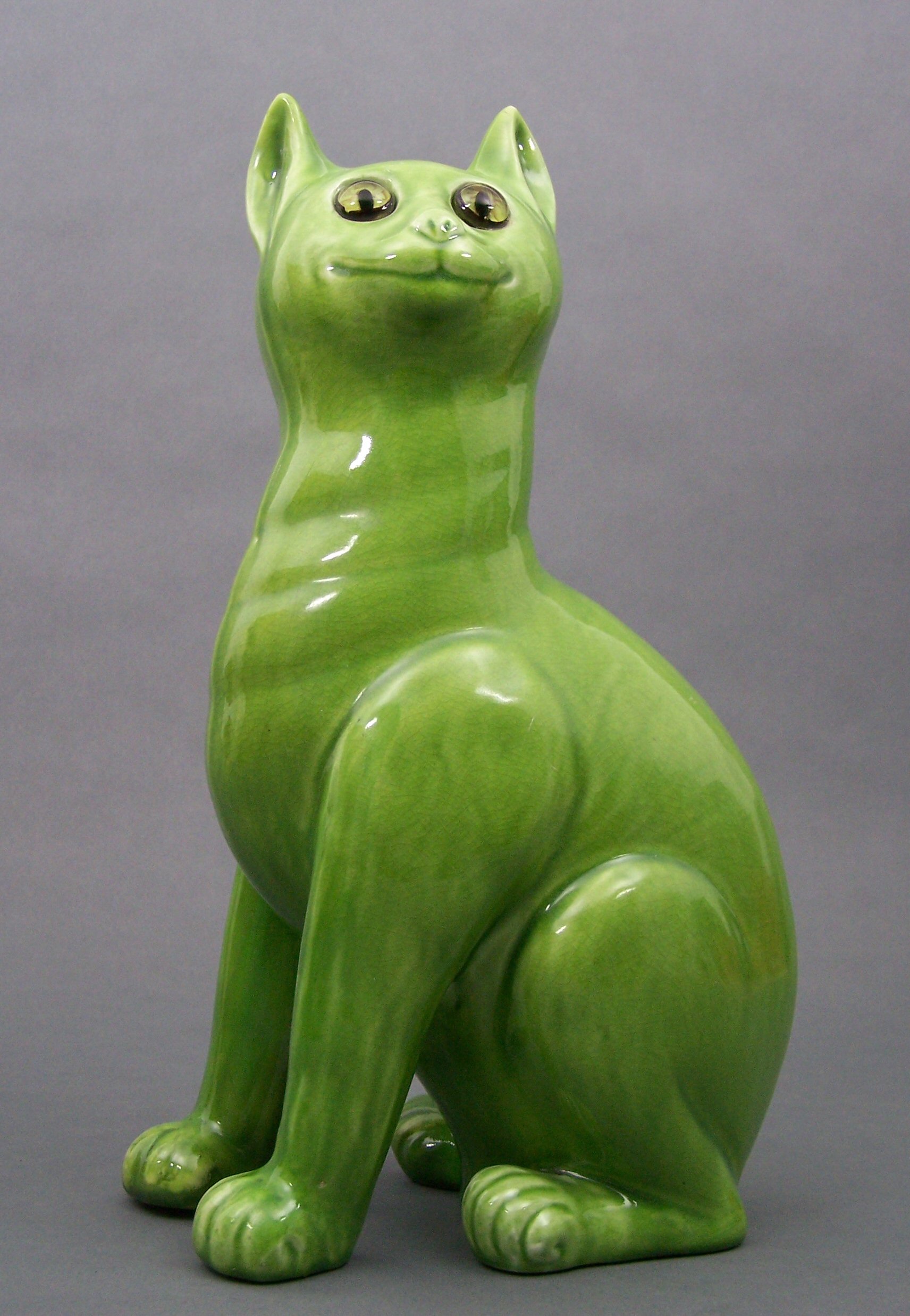 modelled in an upright seated position, with smiling face and applied green glass eyes, glazed in green, impressed mark 'Wemyss'