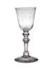 the rounded funnel bowl with two putti standing lightly draped with flowing scarves, one handing a wine glass to the other, symbolising 'friendship', a third putto lying on a cloud above, holding a wreath over the heads of the other putti, the bowl supported on a stem with a clear knop, a beaded knop and a plain section with a basal knop, on a circular domed conical foot
