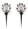 patinated steel and glass, each with stylised laurel leaf garland enclosing coloured glass orbs above conical torchere and circular backplates (2)