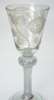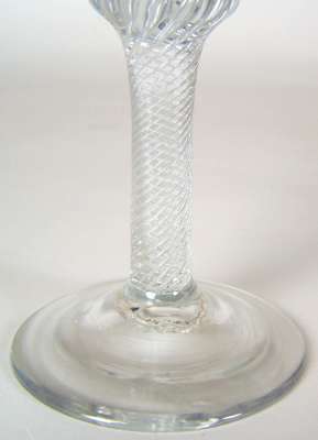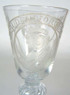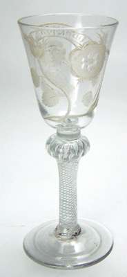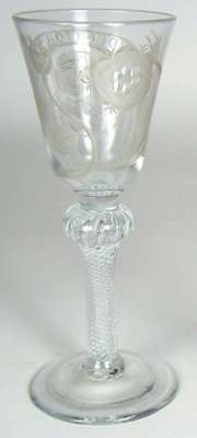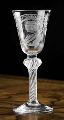 the funnel bowl decorated with a portrait bust of Prince Charles Edward Stuart beneath a scroll inscribed 'audentior ibo' and with heraldic rose and buds, above a spiral twist knop and air twist stem with conical foot