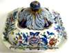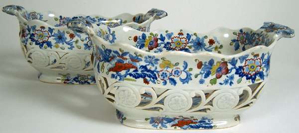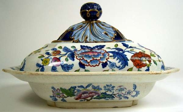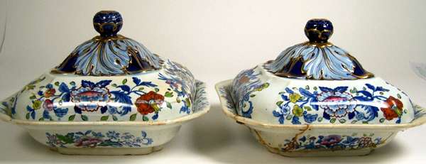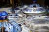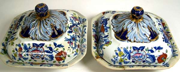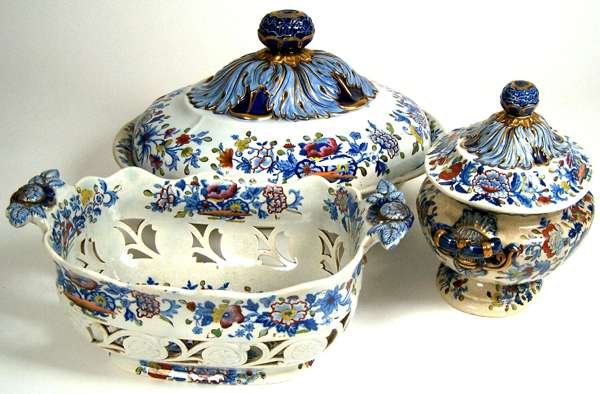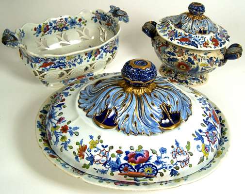 decorated with underglaze blue and polychrome enamels with chrysanthemums and other flowers, comprising: two oval vegetable dishes and covers; three square dishes and covers; two pierced twin-handled dishes; two sauce tureens, covers and four stands; a tureen lacking cover; two pickle dishes; thirteen graduated serving dishes; a drainer; thirty-nine dinner plates; twenty-two fish plates; nine dessert bowls; and twenty-two side plates, some with blue printed mark 'Dresden Opaque China' (damages) (qty)
