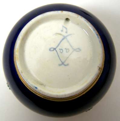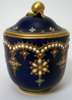 with gilt fruit finial above cover and body decorated with gilt scrolls and stylised flowerheads with red and white jewelling, blue painted crossed L mark and date code for 1778